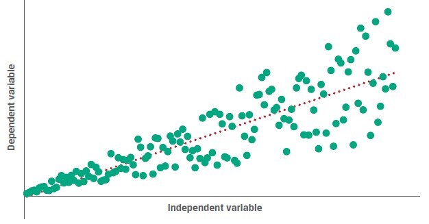 同学你好。如果出现条件异方差,会像下图一样,散点会在回归线附近像喇叭形状一样分布。散点到回归线的距离用残差表示,像喇叭形状一样呈现,意味着残差方差随着自变量逐渐变大或变小,呈现条件异方差。如果散点均匀分布在回归线附近,意味着残差的方差都差不多,没有趋势变化,所以为同方差。