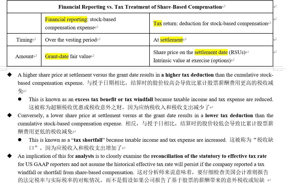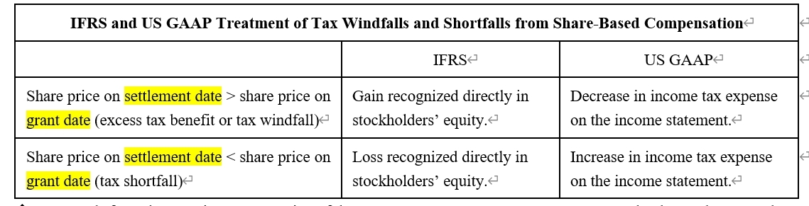 授予日股价>settlement股价,所以有tax shortfall,IFRS确认在equity中(不影响税率),US gaap确认为tax expense(导致税率更高)