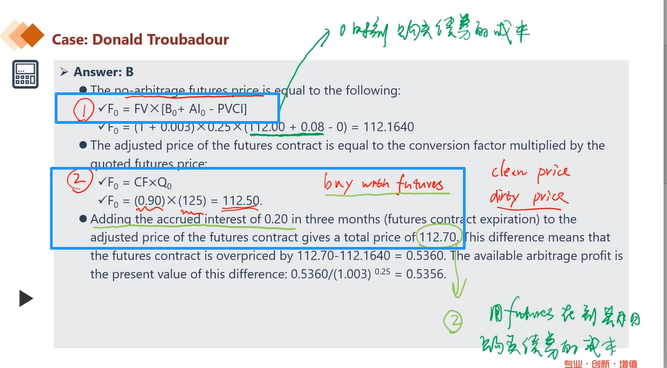 同学你好,这道题目是在求期货的套利利差,视频讲解中老师也解释了,其实就是看用期货买和用现货买同一标的债券,价格是否一样。
