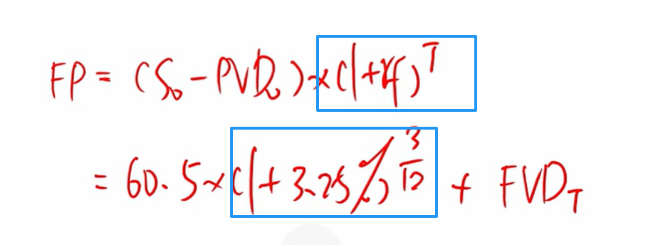 同学你好,第五题,计算过程中下图画蓝色框的地方就是考虑了3个月合约期调整无风险收益率的部分。