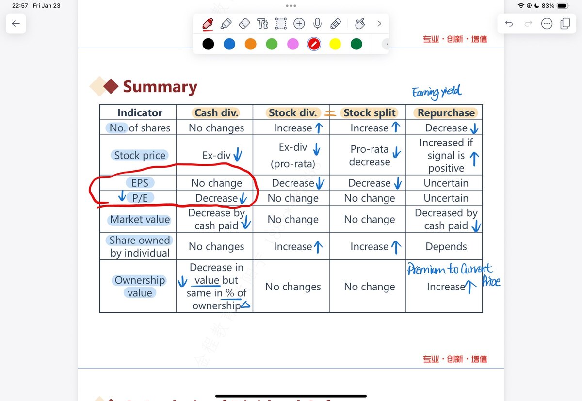 老师好,我理解了“支付股息,传递正向信息,投资者要求回报率下降,cost of equity下降,股权成本Re下降,从而算出来的Vo估值会更高,使得股价变高”。