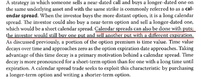 同学你好,这里是指call,考试一般也只会考call,当然这个策略是可以用put的。long calendar本质是针对标的资产有相同执行价格,买远期合约,卖近期合约。利用这个calendar的动机是因为期权的价值是内在价值+时间价值。策略赚取的是一个时间价值。