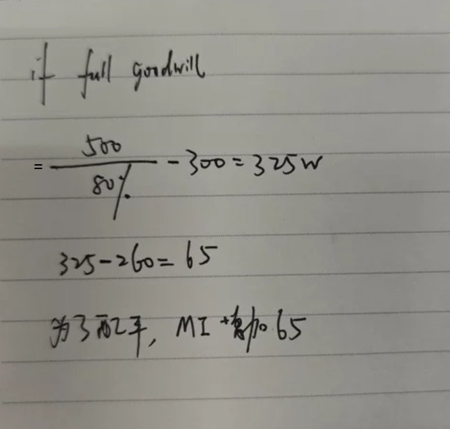 如果是full goodwill就是截图1的goodwill和MI同时增加65