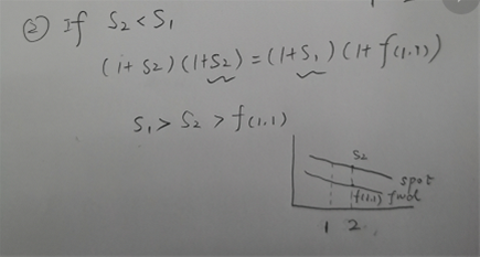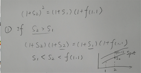 同学你好,看图。看第一种情况,是upward yield curve的情况,所以s2大于s1,如果想让等式成立,f肯定要大于s2, 因此整个fwd yield curve在spot yield cuve之上; 再看一下第二种情况,是downward yield curve, 所以s2小于s1, 如果想让等式成立,f需要小于s2, 因此整个fwd yield curve再spot yield curve 之下。
