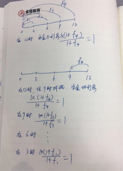 衍生品,T-bond futures。纪老师网课视频第4个,54分50秒处;纪老师讲义第47页例题中浮动利率部分求PV过程中,为什么在1时间点只有两笔现金流,1和f1呢?纪老师说,f2,f3和f4都包含在“1”里面了,这部分不理解,请老师解释一下,感谢!