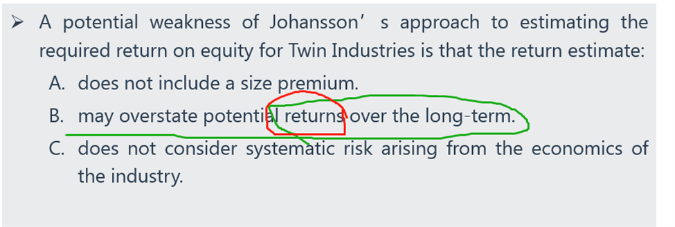 同学你好,erp偏低,折现率偏低,估值会偏高。这个估值是指价格偏高,而不是return。b说的是overstate return。对于return来说,应该是低估了。注意区分。加油!
