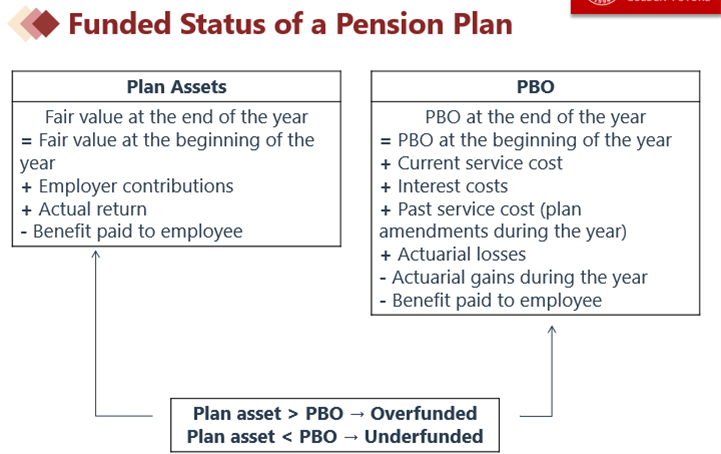 plan asset:因为企业要给员工交养老金,所以它要准备资金给员工支付养老金,准备的这些资金就是plan asset,它和plan liability的关系如下
