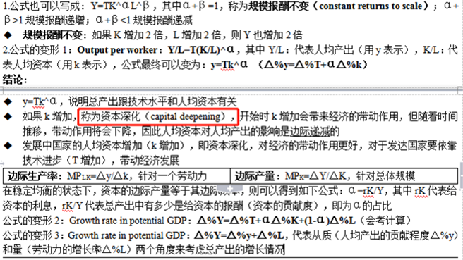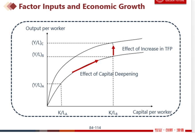 1.请看PPT讲义,这个线是弯弯的么,比如k(横轴capital per worker)每增加1,y(output per worker)纵轴上的值,的增加值是慢慢减小的,资本深化没有对应的字母表示,他是一个过程