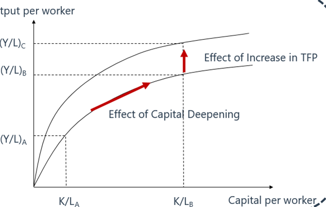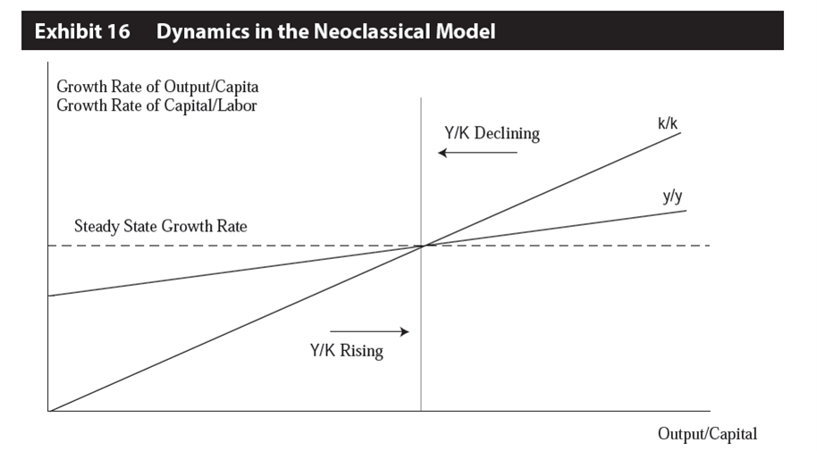 如果产出资本比率高于其均衡水平,人均产出和资本与劳动力比率的增长率高于稳态速率。 这相当于实际储蓄/投资超过所需投资的情况,人均产出的高于趋势增长是由资本深化的高于趋势率推动的。这种情况通常反映出相对较低的资本与劳动力比率, 从长期来看,人均产出和资本与劳动力比率的增长率下降到稳态。