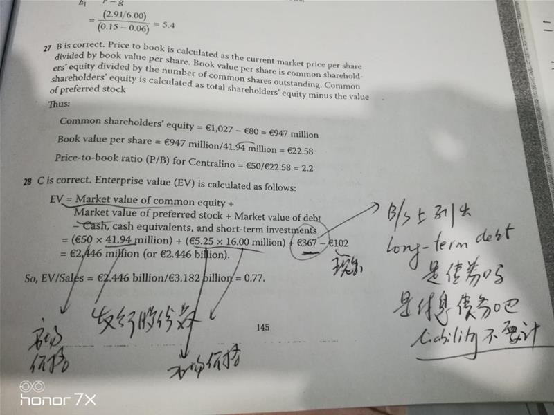 你好,我大概了解了,也就是说,这里全部按照市场价格来乘以股份数求价值,债务DEBT因为题目提示了,实际价值就是账面金额,而LIABILITY,是负债但不是付息债务,例如A/P,所以不要记到EV里,但是我不明白实际上如果这样算EV企业价值,一个企业如果有大量的应付款,也可能是负债累累的,这样EV就估值不准了吧,感觉看这个EV意义不大,因为很多企业经营过程中,应付款尽量拖时间