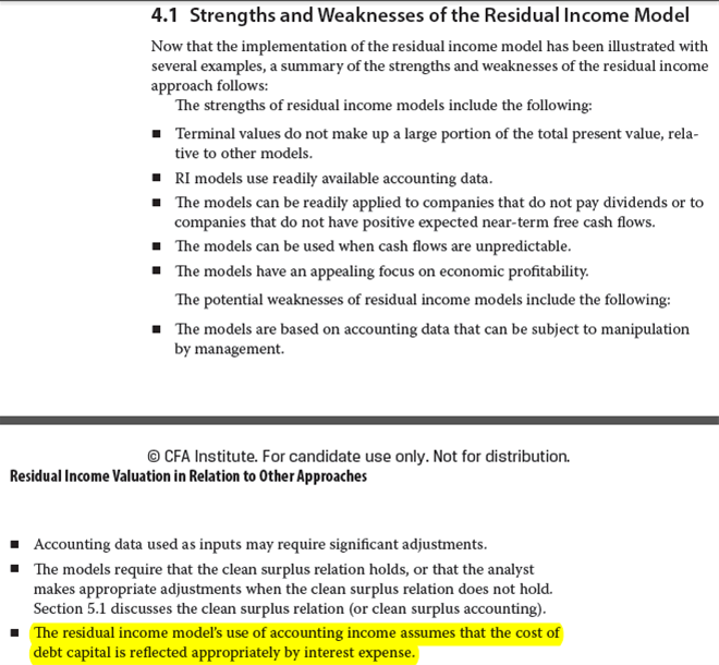 主要考虑角度是剩余收益模型是根据会计收益上再做调整的,会计收益在计算的时候,其中的利息已经适当反映了债务的融资成本。