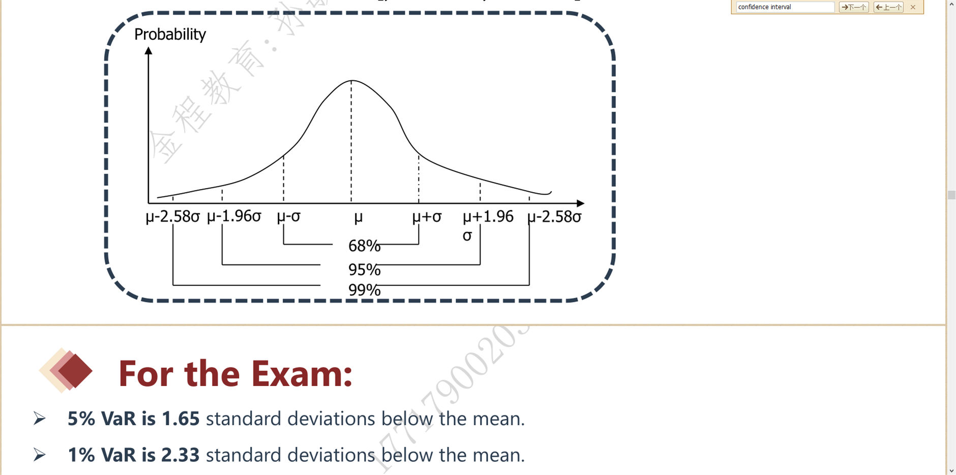 同学你好,VaR主要是考虑损失,所以是单尾的,只考虑左边。它和数量分析中的双尾置信区间是不一样的。这里95%是指左尾有5%,而右尾是塞满的。