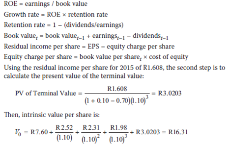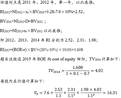 在 case mangoba 中 倒数第二题 intrinsic value pv of terminal value=RI*W/1-R+W, 题目中讲解说是折现到现在 ➗1.1^ 4,但是答案中是1,1^ 3, 请问是折到2012 还是2011呢?