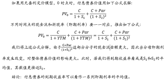 2.Spot rate可以理解为若未来时间段为1年,spot1=5%。5%表示站在0时点,投资者一次性投资1年的年回报率。那么这时候我们就可以用对应时点的Spot rate来折现计算债券价值。通常我们用计算器或者一级学习时用的是YTM计算债券价值,Spot rate和YTM关系可参考图片二。