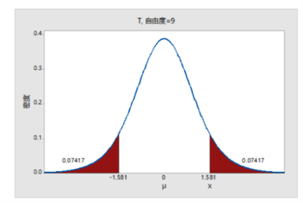 1.如下图,比如t分布的critical value是1.581,我们计算得到的t值如果大于1.581,就是超出了置信区间,落在红色拒绝域中,就要拒绝原假设(负critical value就是左侧的拒绝域)。