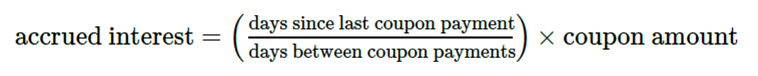 Accrued interest计算公式如图。实际的含义,我举个例子,比如t=3和t=6时刻,有两笔coupon,中间没有现金流。如果我想在t=5时卖出债券,如果光得到一个债券的价格其实不合理,应该考虑持有债券的这段时间付出的成本,也就是得到2/3的coupon,这样才是合理的定价。所以需要考虑Accrued interest。