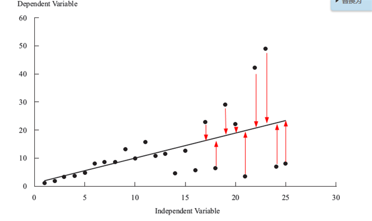 条件异方差是指残差的方差不恒定。如图所示,前面数据的残差很小,那么方差也小;后面数据的残差很大(如红色箭头展示的),方差也大。因此条件异方差讲的就是残差方差不恒定这个问题。