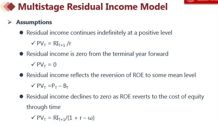 但是韩霄老师在讲述到Multistage Residual Income Valuation这部分总结的时候说到这个问题,实质上1,2,4这三种情况都是属于GGM模型,可以用一个公式PVT=RIT*(1+g)/(r-g)且𝜔=1+𝑔来代入理解计算。