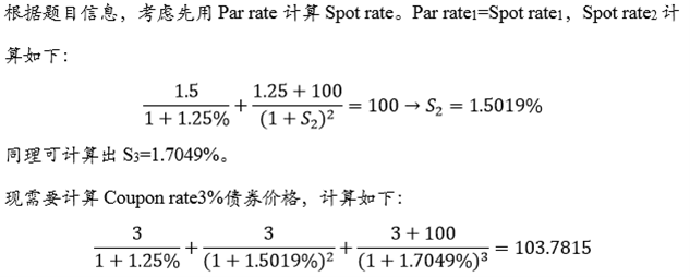 第二期,Par rate=coupon rate,因此分子位置上的coupon=1.5%*100=1.5,分母位置上,第一期的S1我们在第一期已经计算出是1.25%,代入后求解S2。即我们在第二期用的Coupon rate的确是1.5%,且在计算S2时,每一期的Coupon都是固定的。
