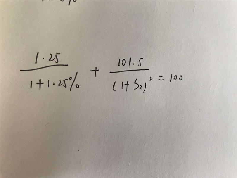 同学写出的公式里,第一个式子分子位置是1.25。如果是两年期债券,Coupon rate固定,那么每一期的Coupon也是固定的,因此应该是1.5。
