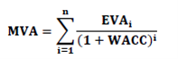 MVA(Market value added)= market value – total capital (MVA = 公司的市场价值 – 总资本,即为EVA的折现现值之和)