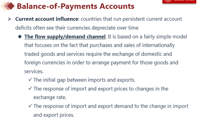 当经常账户持续顺差时,本币会升值,如果逆差就会贬值。那假设目前是顺差,所以本币升值。但是本币升值又是对出口不利的,因此之后又会导致出口下降从而使得经常账户恶化,最终的结果是贸易回归平衡,没有顺差也没有逆差。这里就有三个因素,它们探讨汇率应该变动多少才能使得经常账户回归平衡。