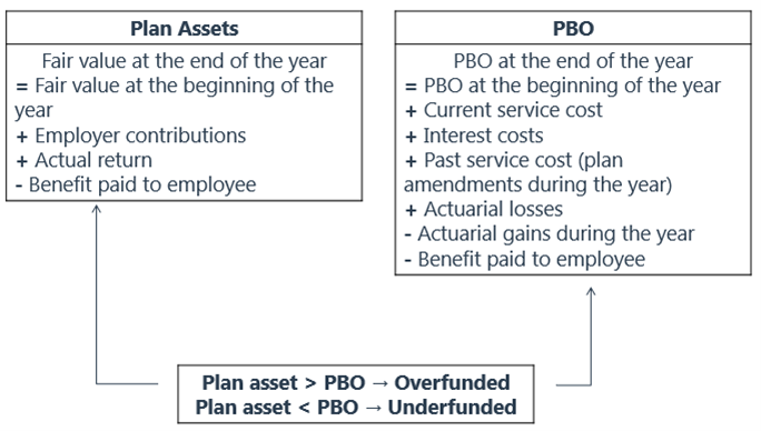 2.Funded status是PA-PBO,PA里面包含的是真实回报,也不是预期回报。具体逻辑关系如图