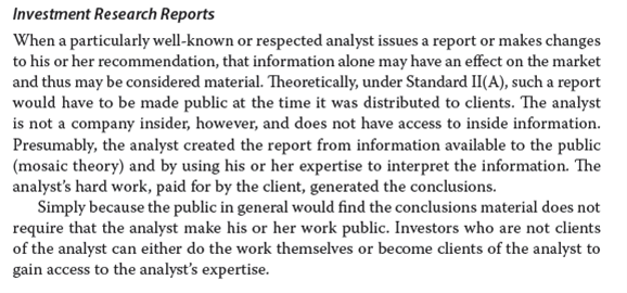 同学你好,我的解答是严格基于CFA官方教材的。官方考纲写道知名分析师的报告的确是重大消息,所以理论上给客户使用的同时也要将其披露。但是考纲又补了一句:分析师不会是公司内幕人士,也就不会获得内幕消息,因此他们报告的制作是符合马赛克理论的。虽然人们会认为分析师的报告是重大信息,但是分析师并不需要把它的报告公布于众,这和我们强化课讲义的说法是完全一致的。如果同学你觉得有困惑的话,我把原版书对于这部分的表述附在下图中,这是最权威的官方说法,同学你跟着原版书来理解就肯定不会出错。