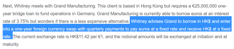 题干有问题,Whitney建议的是borrow HK$,此时进入互换,应该是receive euros,pay HK$。有HK$,才能在互换时payHK$。