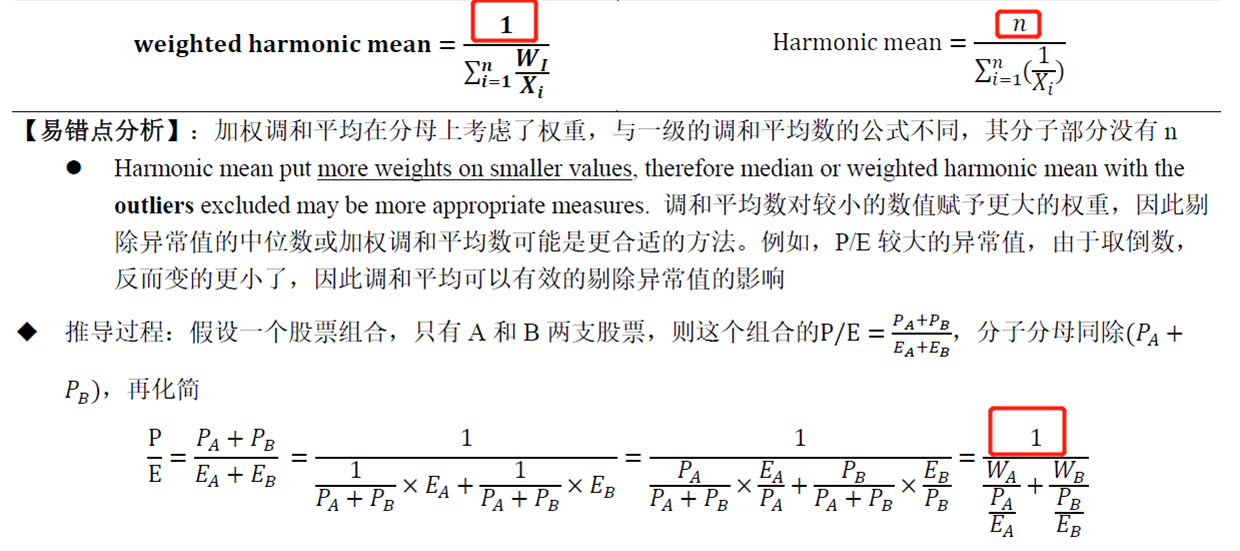 在算PE的时候,这个公式与我们一级讲的调和平均的公式不同。在算PE的时候是加权平均,而一级的公式是算数平均,所以他是用上面的n来体现权重,而加权平均是用WA和WB来体现权重。