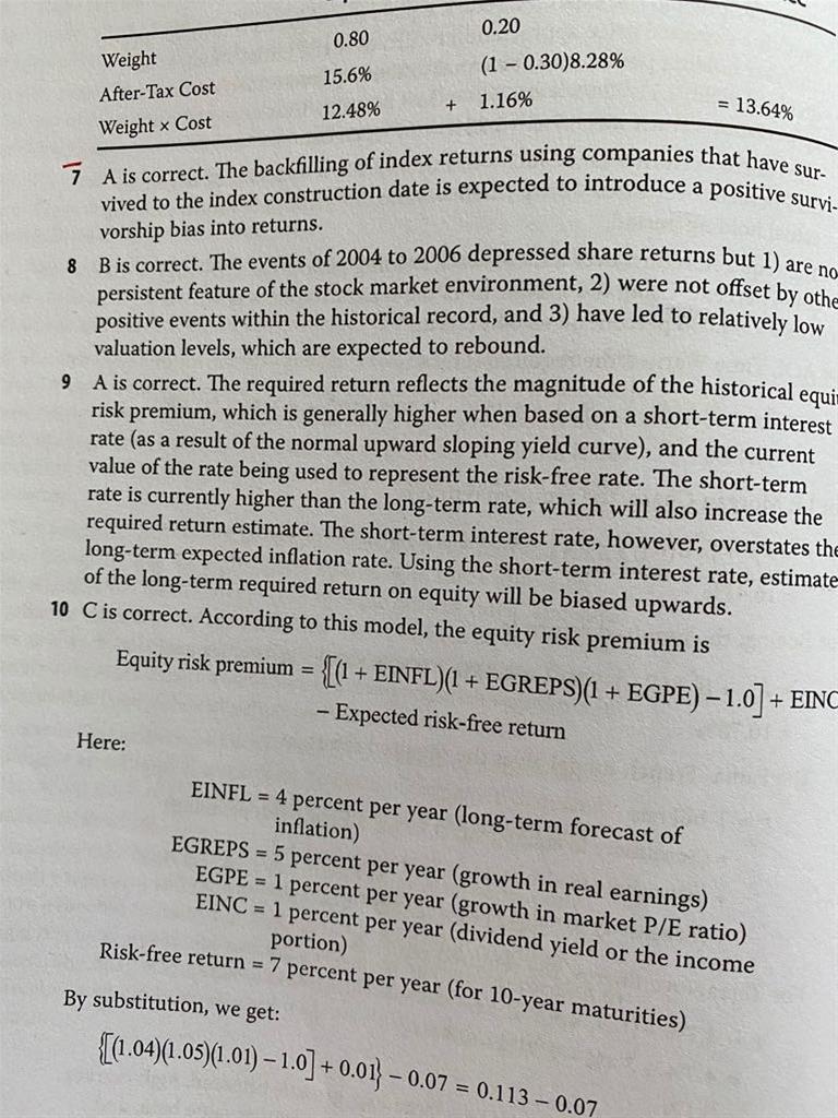 第 8题,因为军事冲突,所以那段时间的市场回报低,即RM低。用历史法计算ERP=RM-RF,所以算出来 的ERP也会低。他问我们这个情况ERP是高还是低。没问应该上调还是下调。你要仔细 审题,看他问的是什么。这个我当时在北京上课的时候还特别强调过。如果ERP低估,那就要上调。要看他问的是ERP高估还是低估,还是应该上调还是下调。