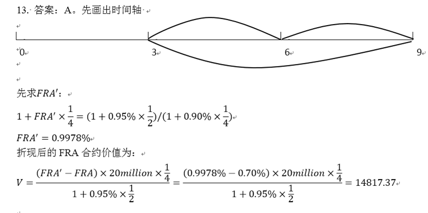 3.13题其实是签一个反向合约,两者轧差,折现求估值。反向合约的定价就是根据定价公式求得,轧差后由于FRA是年化利率,所以需要去年化。然后虚拟现金流(9时点)折现到当前3时点。这样就是求估值的过程。