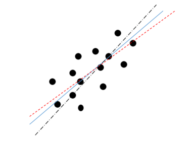 比如图示的数据,对数据进行拟合,可能是蓝线也可能是黑线或者红线,所以斜率会有波动。如何判断哪一条线更好呢?对所有的残差进行平方求和,这个值最小,就是最优拟合,我们就把此时的最优拟合的斜率作为估计的斜率。