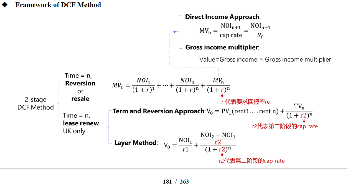 另外有两个特殊情况,Term and Reversion method和Layer method,这两种情况是使用第二阶段的cap rate将TV向0时点折现的,这种方法是根据英国的惯例,才这么算,只有英国才这么做。目前考试没考过这种情况。