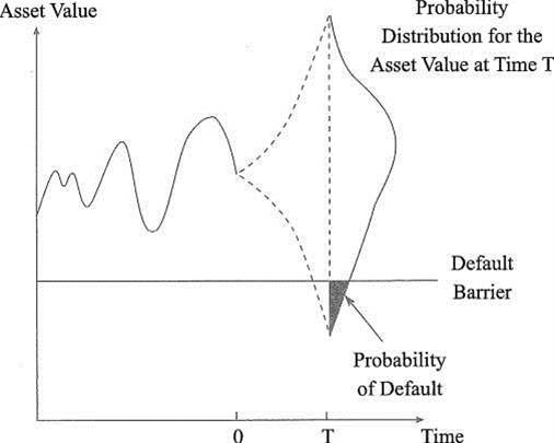请看图,图上面纵轴是公司的资产价值,资产价值在未来某日期T有一个概率分布,处于违约界限下面的部分是违约债务,违约概率会随着资产波动率、时间、财务杠杆的上升而上升。公司资本结构中的债务越少,违约界限越低。一旦资产价值低于违约界限,说明公司债务发生违约。
