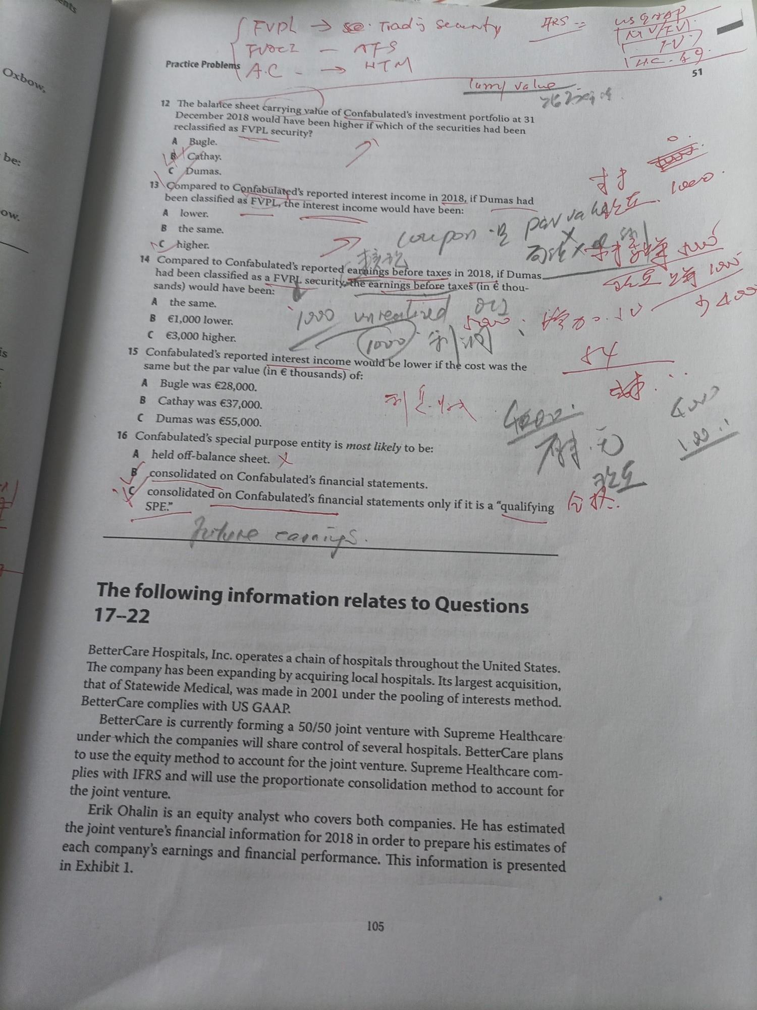 14题(这道题目协会是有勘误的):当分类为FVPL时,未实现损益计入收益。2018年,未实现收益为1000。应选C,1000 higher。