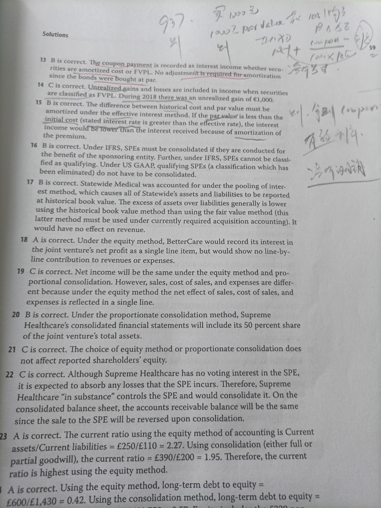 15题:如果初始成本高于票面价值,溢价发行,市场利率小于票息利率,则利息收入将低于因溢价摊销而收到的利息。