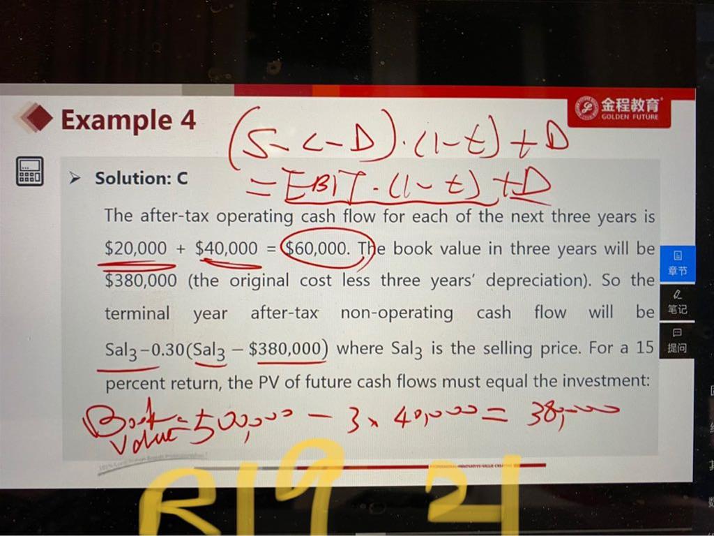 老师 R19的21题 由折扣得到的book value是380000,但这道题求的是卖出时的钱,也就是倒数第二行的sal3。说明此时残值不等于book value啊。