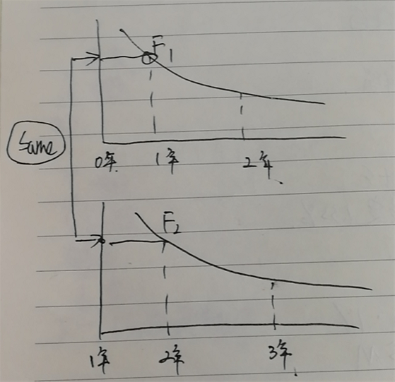 你看我下面的图,如果0年开始,F1是一个价格。一年之后,起点就变成了1,第二年的价格F2和之前在第0年时的F1是一样的。这样来看两条曲线没变。所以F2-F1=0。