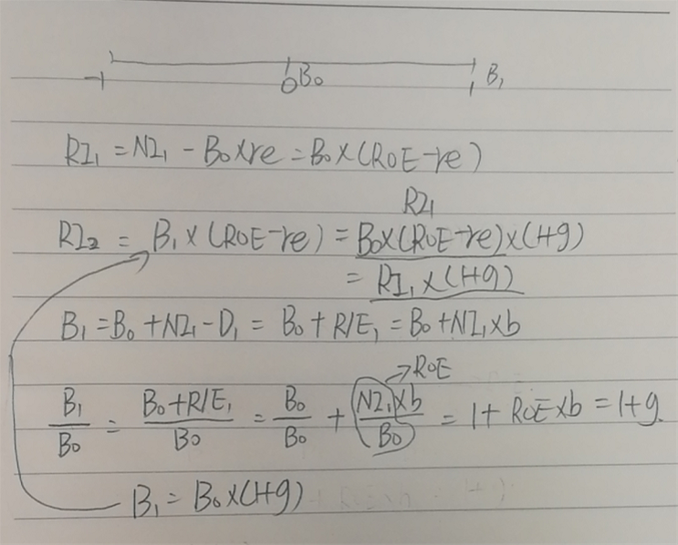这边只要ROE和b是不变的,而且clean surplus relation成立,那RI之间也会按g的速度增长。下面是推导,你可以看一下。