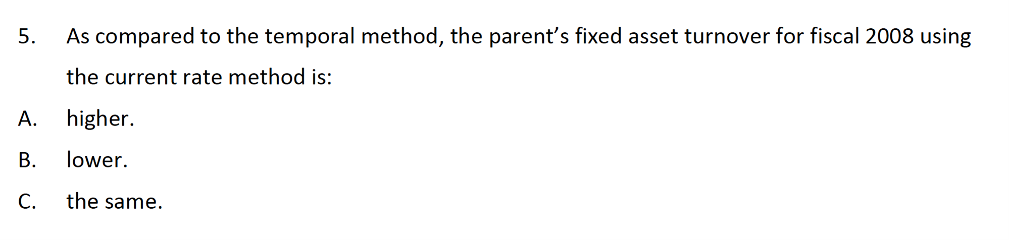 老师请看图片中题目,我的理解是temporal method和current rate method对于sales和fixed asset的汇率采用都是一样,sales是avg汇率fixed asset是historical汇率所以比率应该是不变吧?如果是total asset的话那就不一样的,但是题目问的是fixed asset turnover,谢谢!