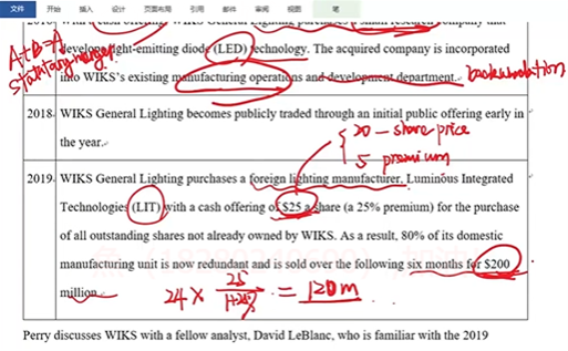 1)计算出收购的每股溢价:Premium per share = $25.00 – {$25.00 ÷ (1 + 25%)} = $5.00 per share;
