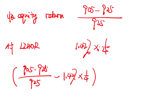 那这道题的最后一问,是用equtiy换90天时候的floating libor interest rate, 为什么这个地方的floating用的是1.42%*4,这里为什么不是1,我理解浮动换固定 和 浮动换股权里的浮动应该是一样的才对?