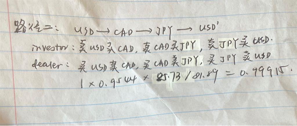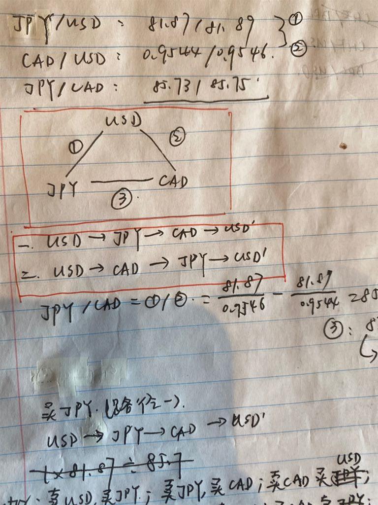 同学你好,可以这么做,就是我和你说的思路,这并不复杂。主要是看第第三个市场的货币,便宜的就在第3市场买入,贵的就在第3市场卖出。就比如这里3市场的JPY/CAD比12市场的JPY/CAD要低,那么就说明3市场的CAD更便宜,就要在3市场把CAD兑换成JPY,于是就能直接反推出来是要将USD兑换成CAD,然后CAD在3市场兑换成JPY,再将JPY兑换回USD即可。