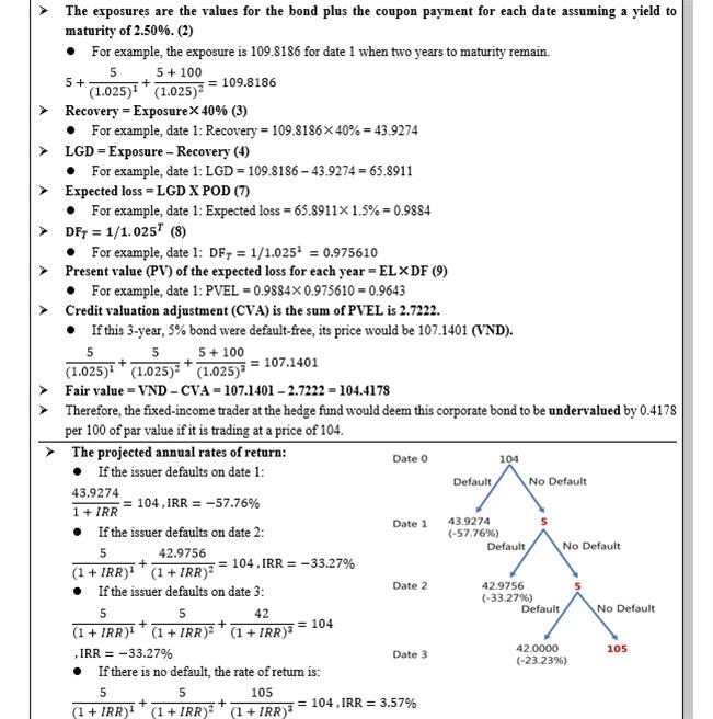 老师您好,这里的例题都是五年期的利率二叉树为risky bond估值FV VND CVA,您能帮忙找一道两年期利率二叉树为三年期Risky bond,分别为coupon paying和floater估值的题目并有详细阶梯步骤的吗?非常感谢