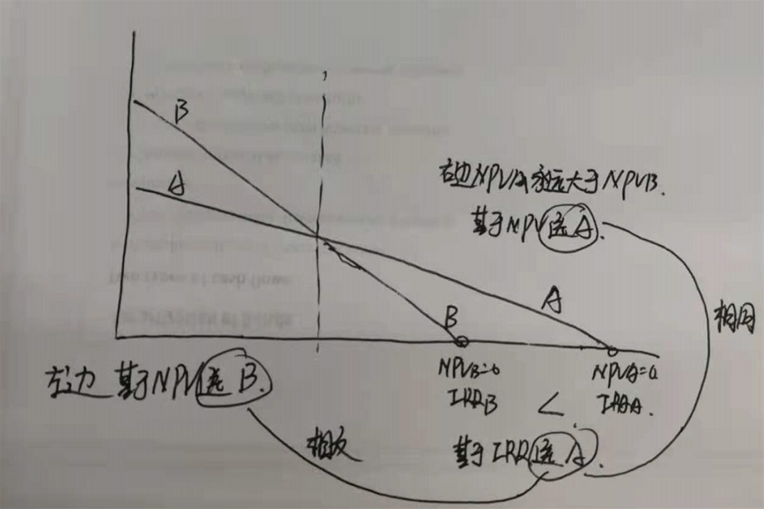 Example 4 的第4题为什么说crossover rate的右边IRR和NPV结果一致,左边则不一致