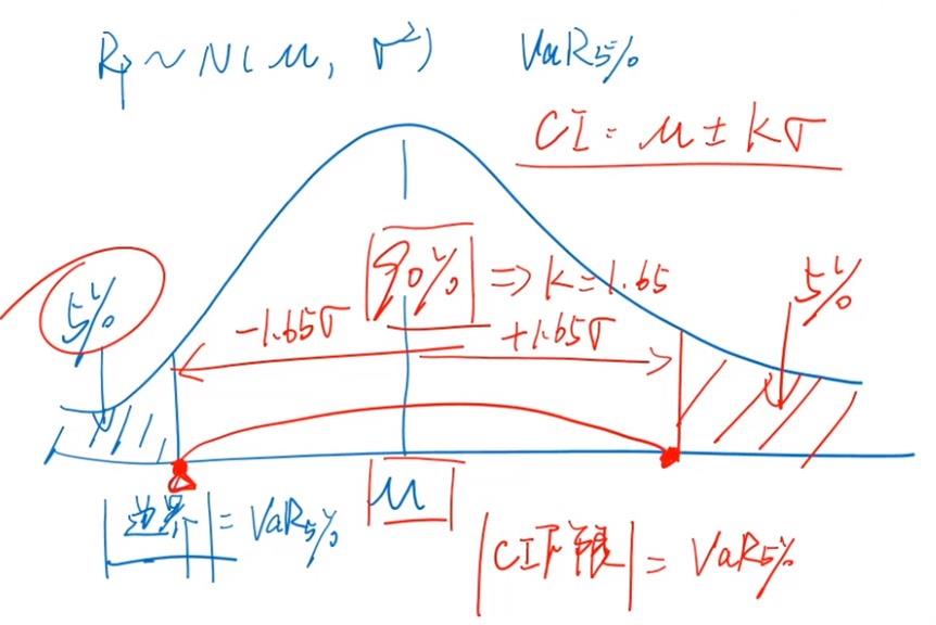以5%的VAR举例,5%的VAR相当于是正态分布下左尾5%处的边界值取绝对值。也即相当于90%(去掉两边5%)置信区间下限的绝对值(见图)。