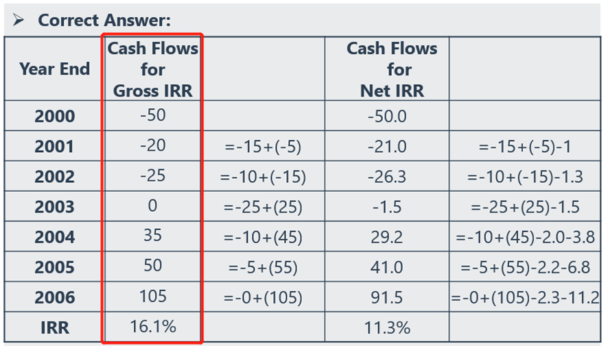 老师好,请问课件performance evaluation of PE fund的例题,171页上,计算gross IRR 的现金流每期是怎么计算出来的?