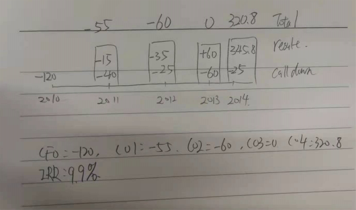 因此把这些现金流标注在现金流量图的表上,这里要注意calldown是在年初,而result是在年底,因此2011年初就是2010年底。我们画现金流的图时,都是以年底来表示的。所以不要画错了。