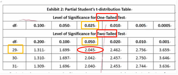 我们只需要看给定df=29这一行,双尾检验two-tail test,alpha=0.05,得到t critial value2.045。